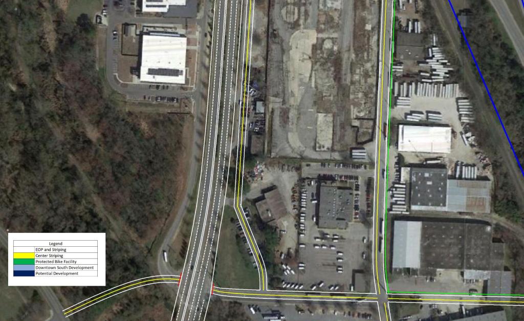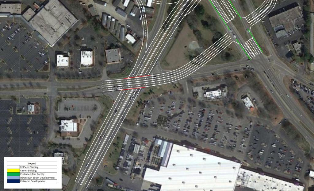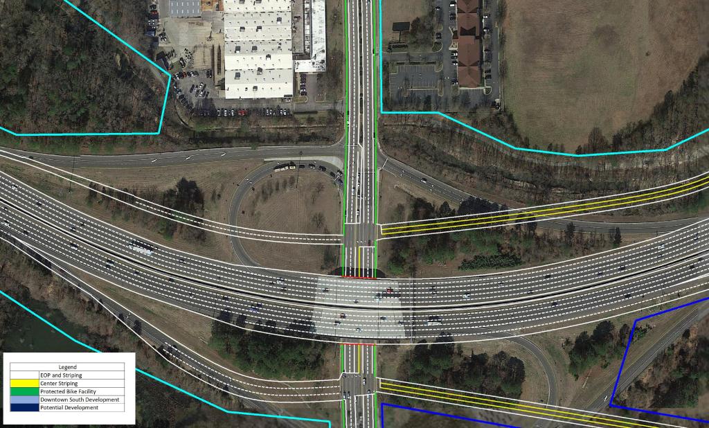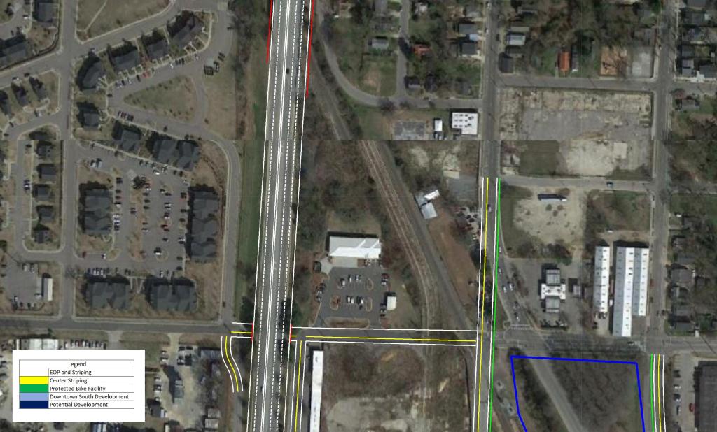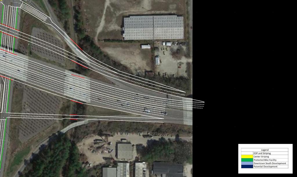 North of I-40 as the route approaches Downtown, grade separations are present City Farm Dr and Hoke St extension. In order to ensure minimal queuing in the AM Peak, the third lane from I-40 would be carried to the signal at MLK Blvd.
