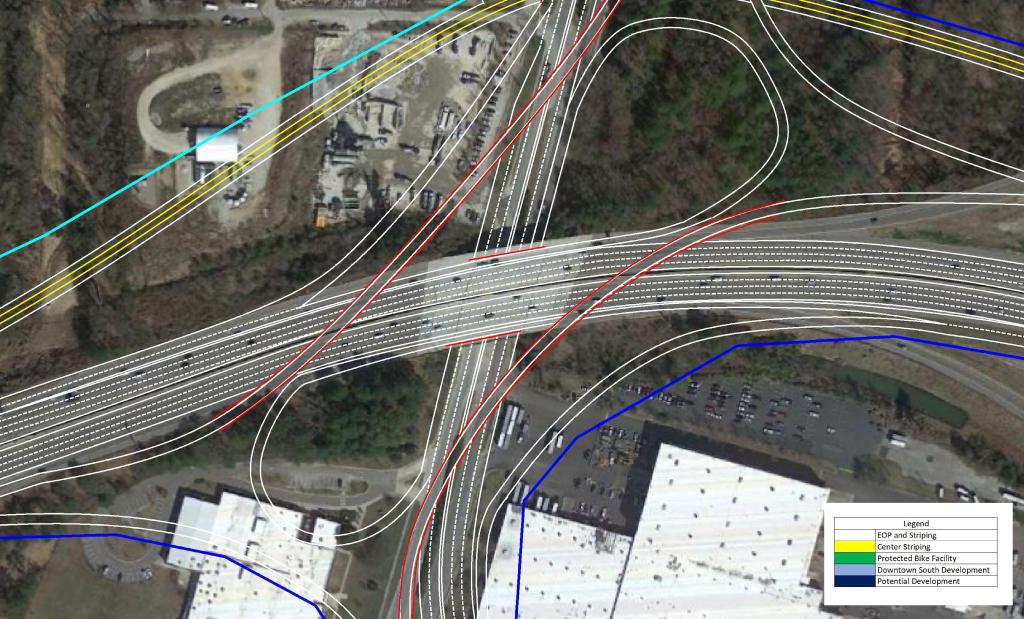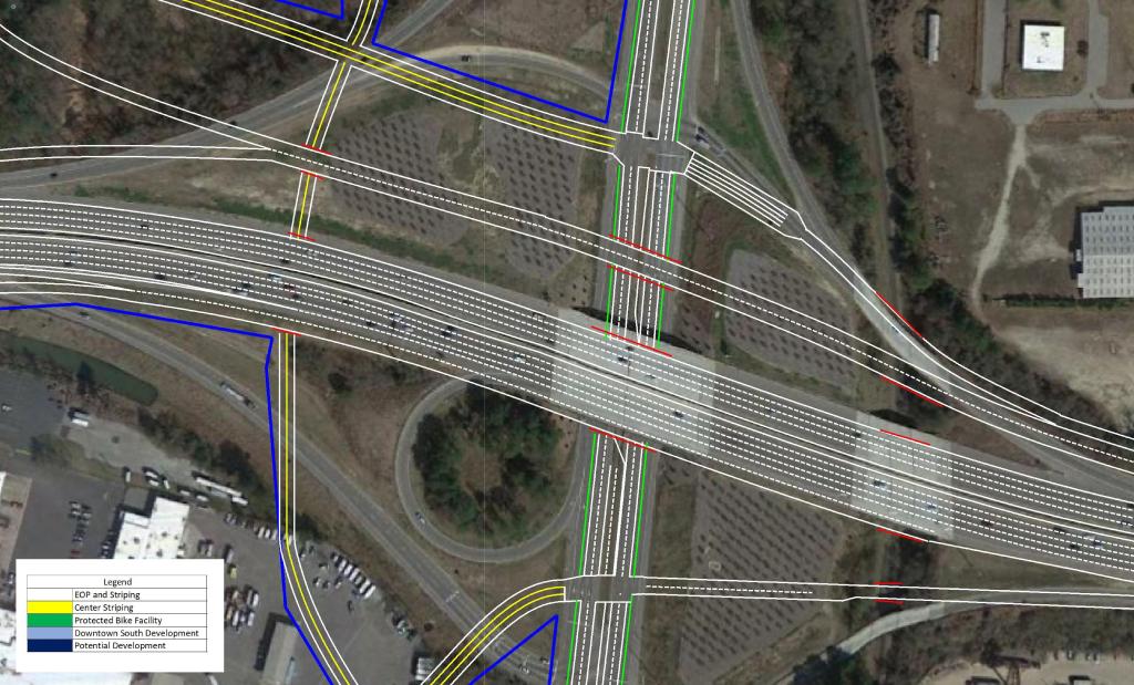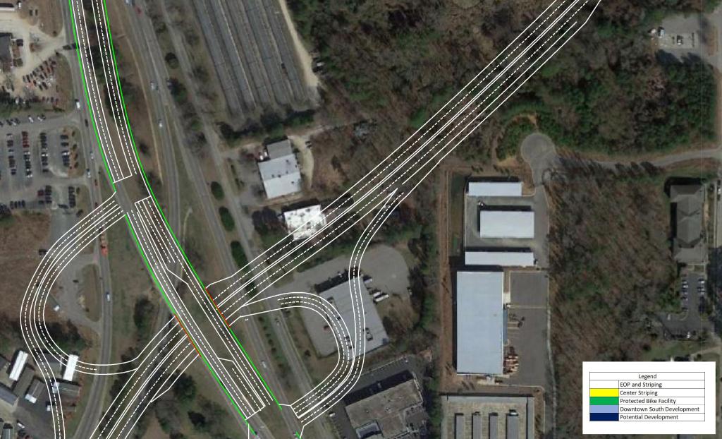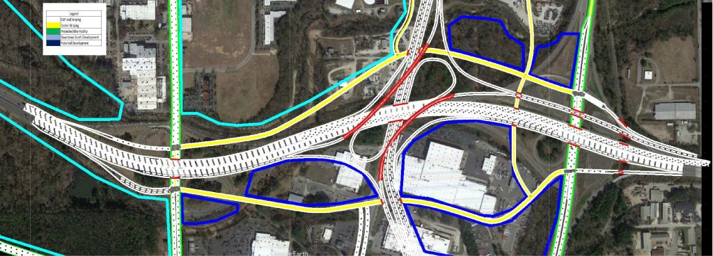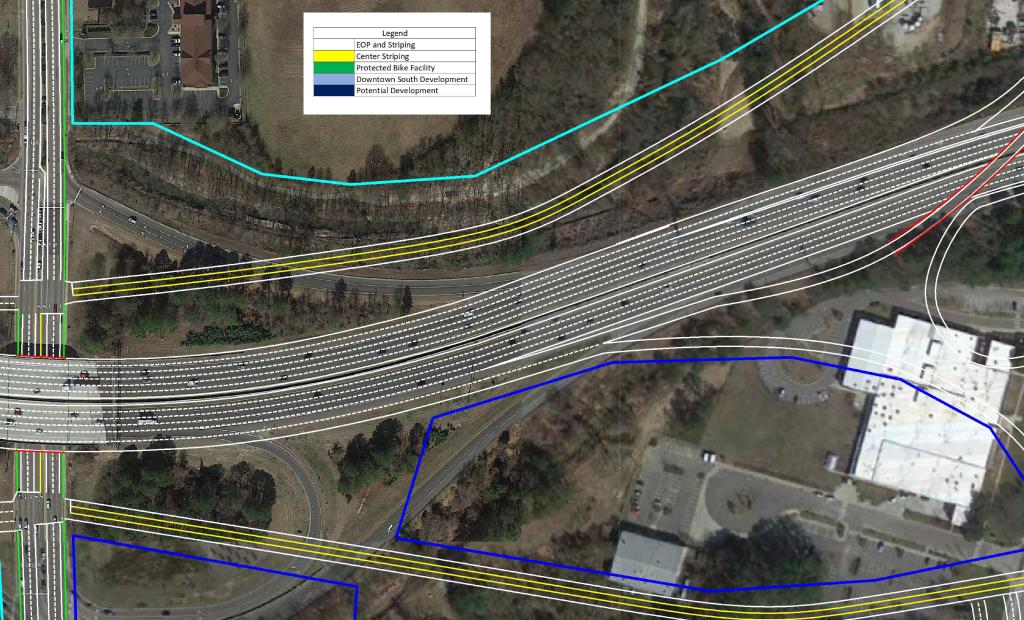 The focal point of the plan features the US 401 Downtown Connector. Currently, US 40 and US 70 merge just South of Tryon Rd to begin their approach to Downtown Raleigh to form S. Saunders St.