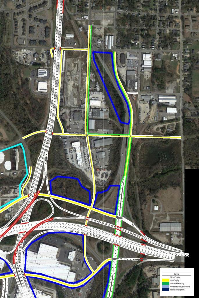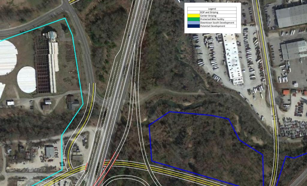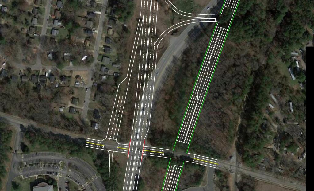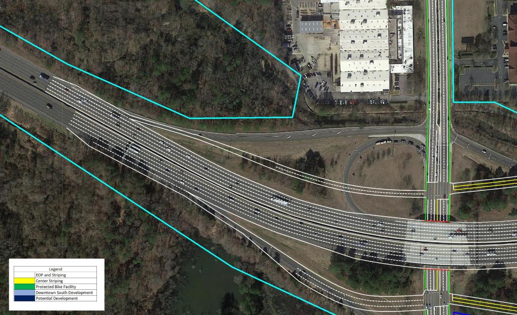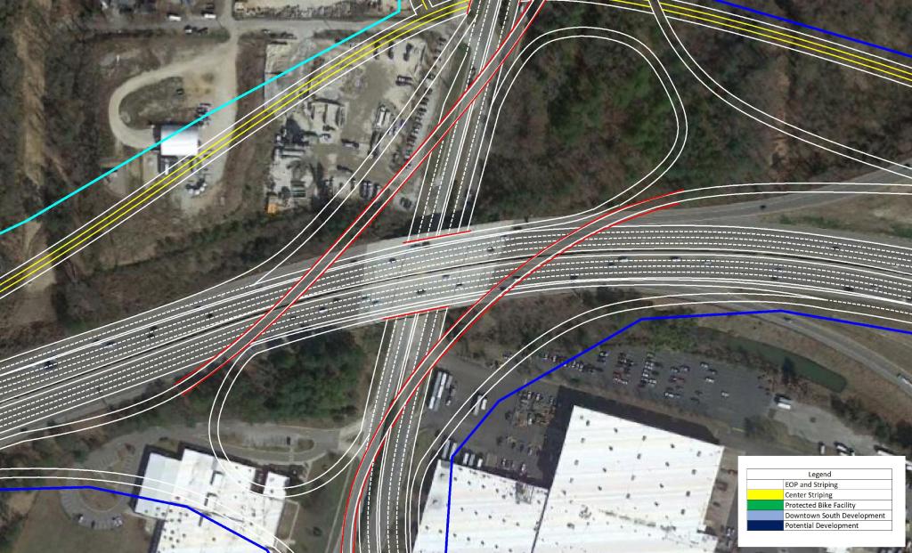 The focal point of the plan features the US 401 Downtown Connector. Currently, US 40 and US 70 merge just South of Tryon Rd to begin their approach to Downtown Raleigh to form S. Saunders St.