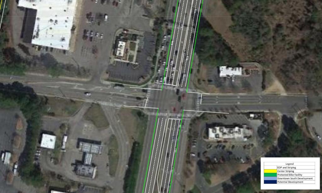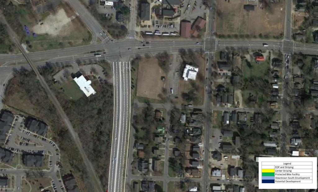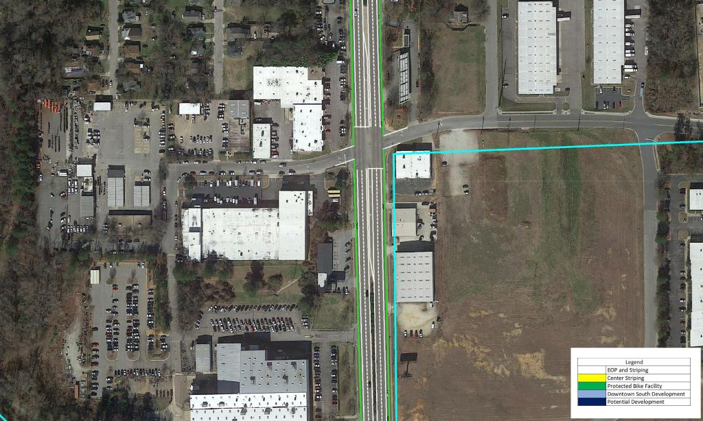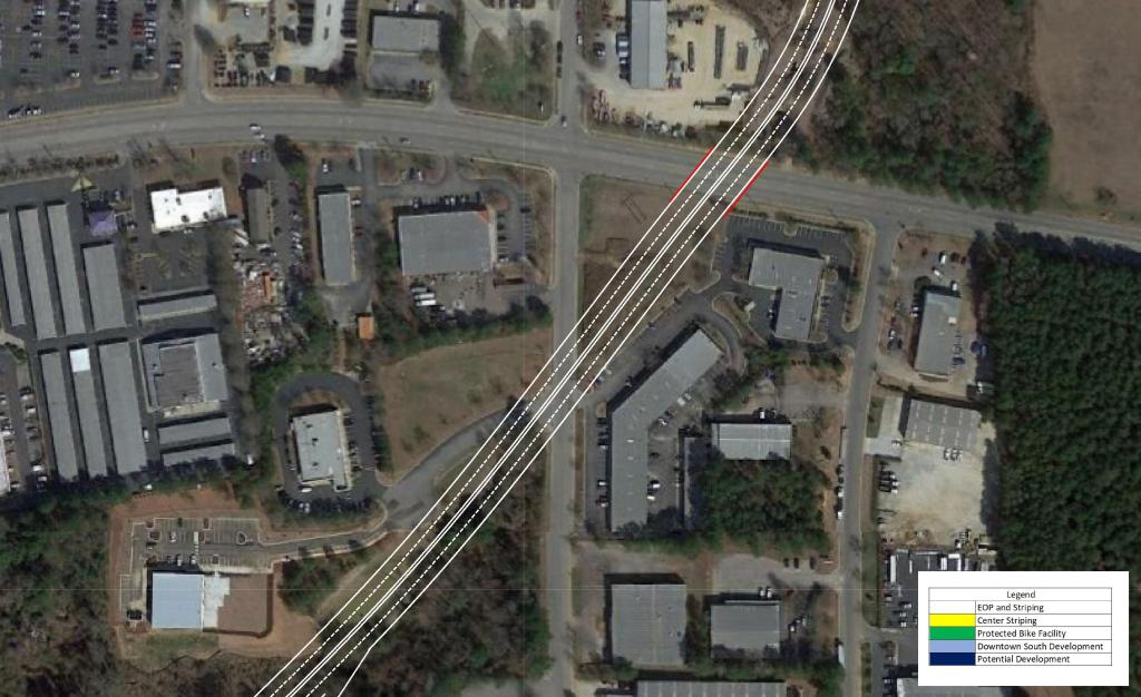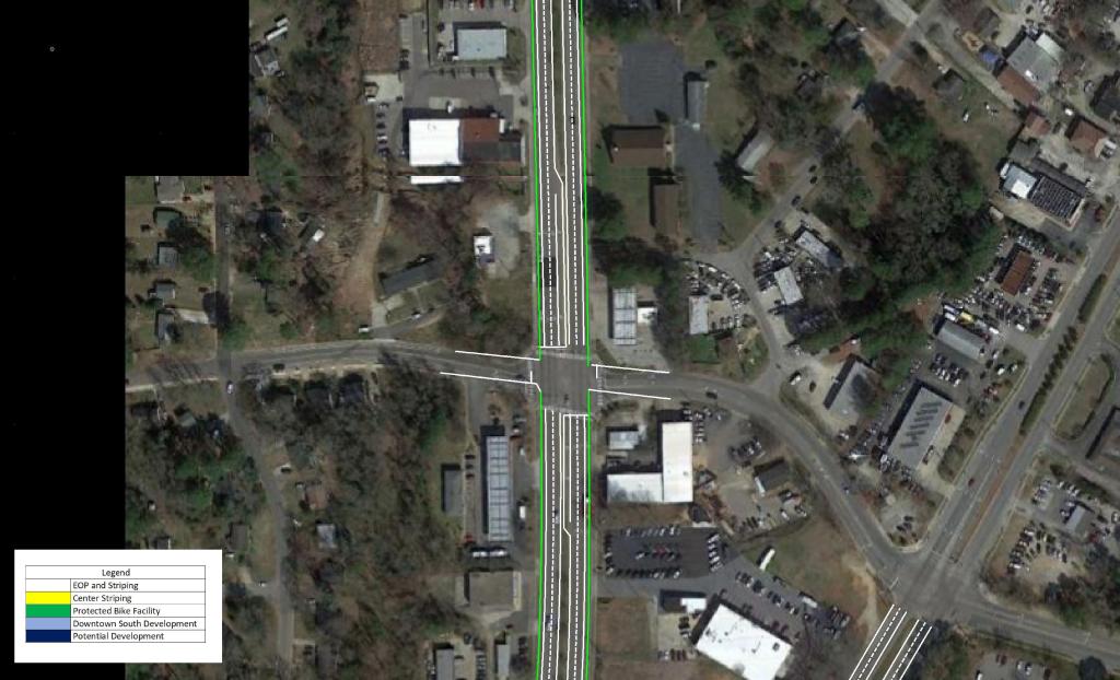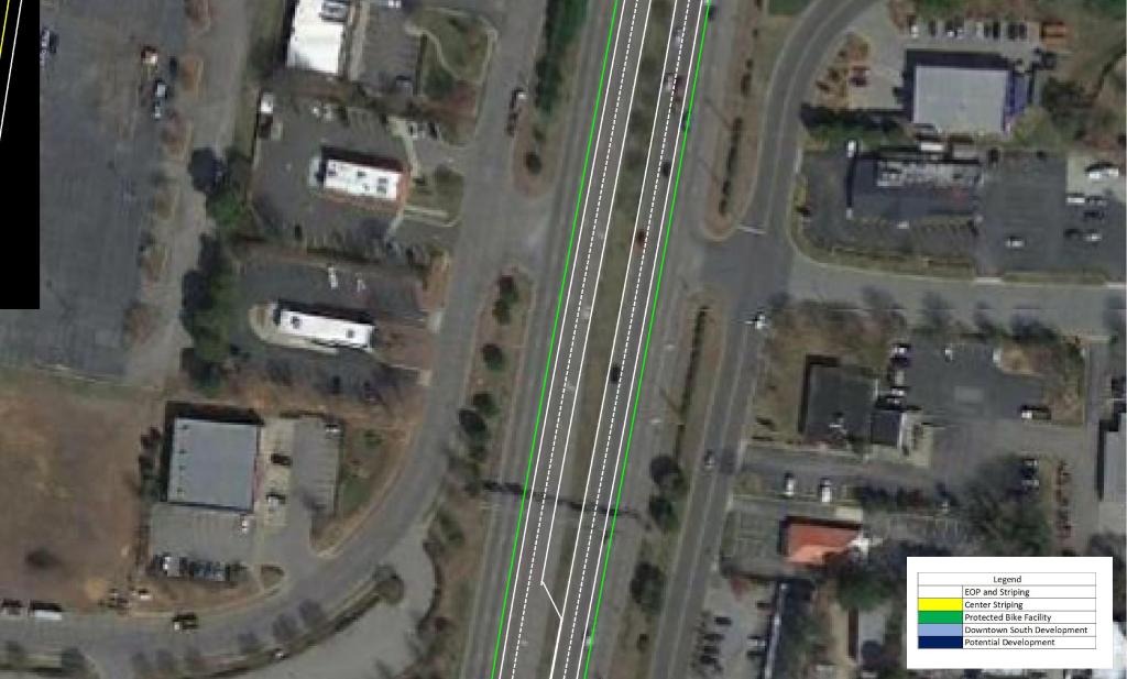 These measures should be paired with a reduction in speed limit along the corridor. This would promote the possibility of urban, dense, and walkable development in the area. As Downtown continues to quickly grow, S Saunders St will continue to become more congested and less likely to see urban development.