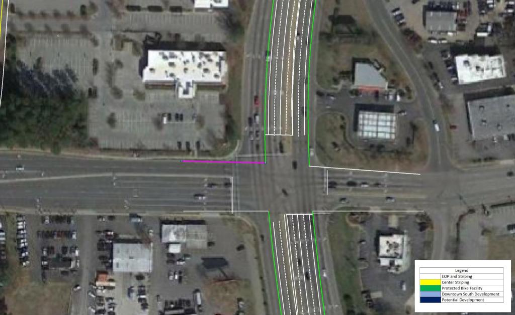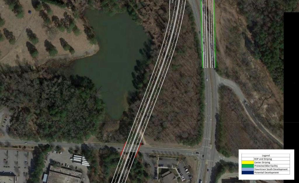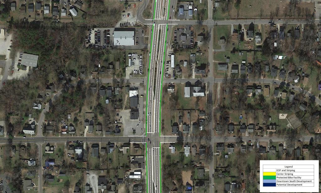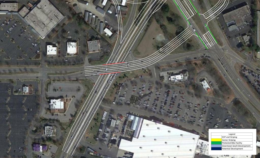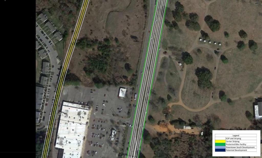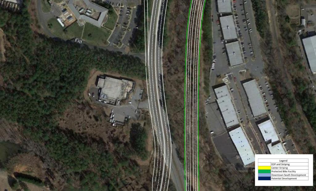 These measures should be paired with a reduction in speed limit along the corridor. This would promote the possibility of urban, dense, and walkable development in the area. As Downtown continues to quickly grow, S Saunders St will continue to become more congested and less likely to see urban development.