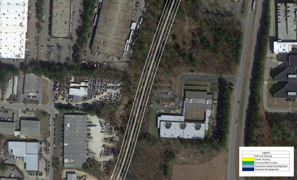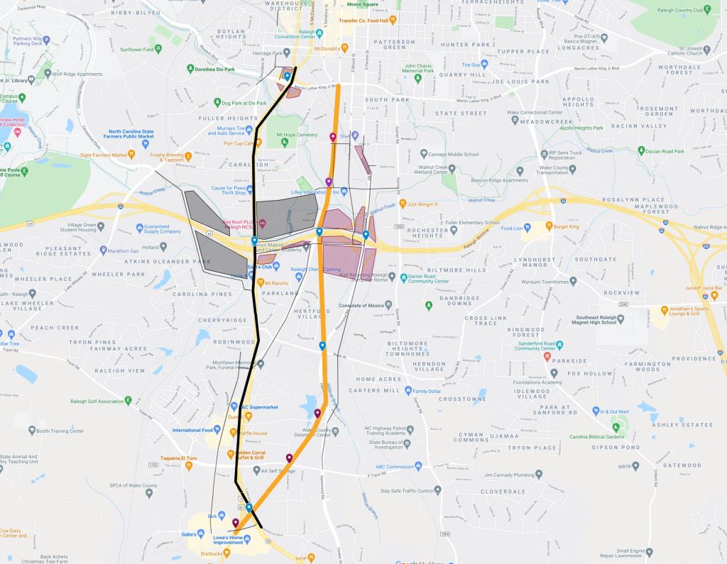 S Saunders St is the primary North – South route in, out, and through Downtown Raleigh. It exists as the primary vehicle and freight route. This leads to a busy corridor that has discouraged development on the fringe of Downtown.