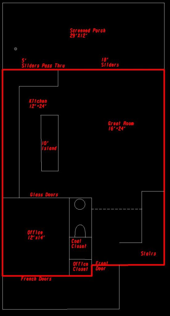 The main living area sprawls with a giant kitchen featuring a 10 foot island and a bar with pass-through leading to the massive 29′ x 12′ screened porch. Opposite sits a great room with 18′ accordion sliding doors out to the porch.