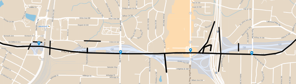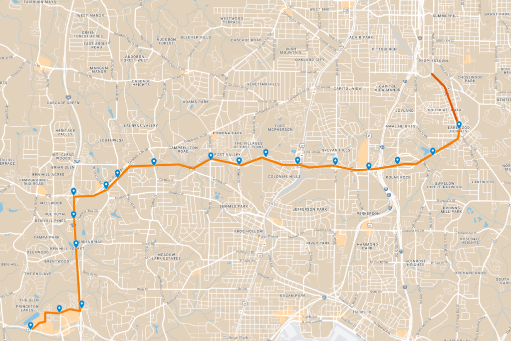 The alignment would essentially be an extension of the Summerhill BRT corridor stretching South from the proposed terminus down to Lakewood Heights. From there, the line follows the transformed Langford Pkwy to where stations at each cross street would serve as new neighborhood hubs. The later phase would stretch down I-285 to Camp Creek Marketplace which is another hub of commerce that is severely transit starved. A direct transfer point to MARTA’s Red / Gold line would be offered at Lakewood / Fort McPherson.