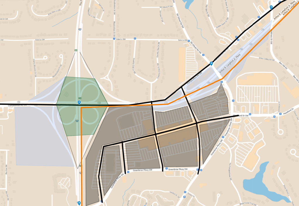 Perhaps the most important focus area would center around Greenbriar. Greenbriar Mall was once the economic hub of Southwest Atlanta. But like most malls, has fallen on hard times. There are currently no anchors, and the building sits on a sea of parking. Any redevelopment of the site should focus carefully on affordable housing and restoration of the Black economic hub it once was. Land can be reclaimed by removing Langford Pkwy, reconfiguring the interchange with I-285, and removing the interchange at Greenbriar Pkwy.