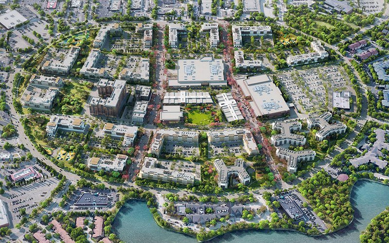 Reclaimed land from the footprint of the highway and ramps would amount to over 50 acres of land available for housing, greenspace and commercial. This is maximized by using the existing alignment of Cambellton Road East of I-285. Other themes of the plan would be restoring the grid structure where the mall and parking lots now stand.