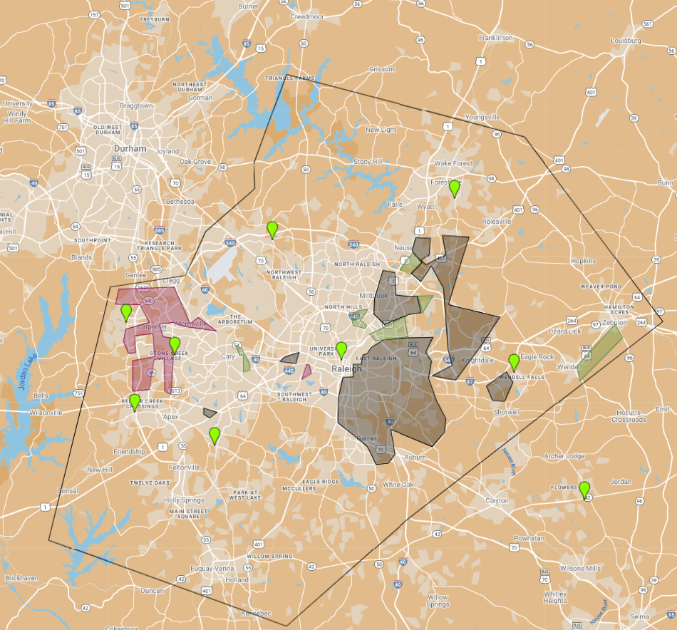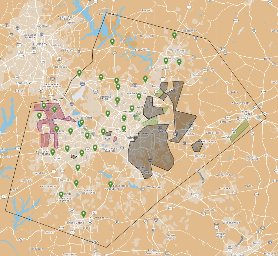 - There are NO Tier 1 or Harris Teeter’s in the Eastern end of the County. Out of 16 Tier 1 grocery stores and 35 Harris Teeter’s there is not even one who has taken the chance on Eastern Wake. While it’s understandable that these stores have their metrics and demographical analysis they go by this is inexcusable. While not as affluent as the rest of the County there are pockets of decent density and loads of middle income neighborhoods on this end of the County. Harris Teeter in particular sticks out as a flagrant example. They claim to be the Triangle’s grocer of choice but are leaving a whole half of the market out to dry.