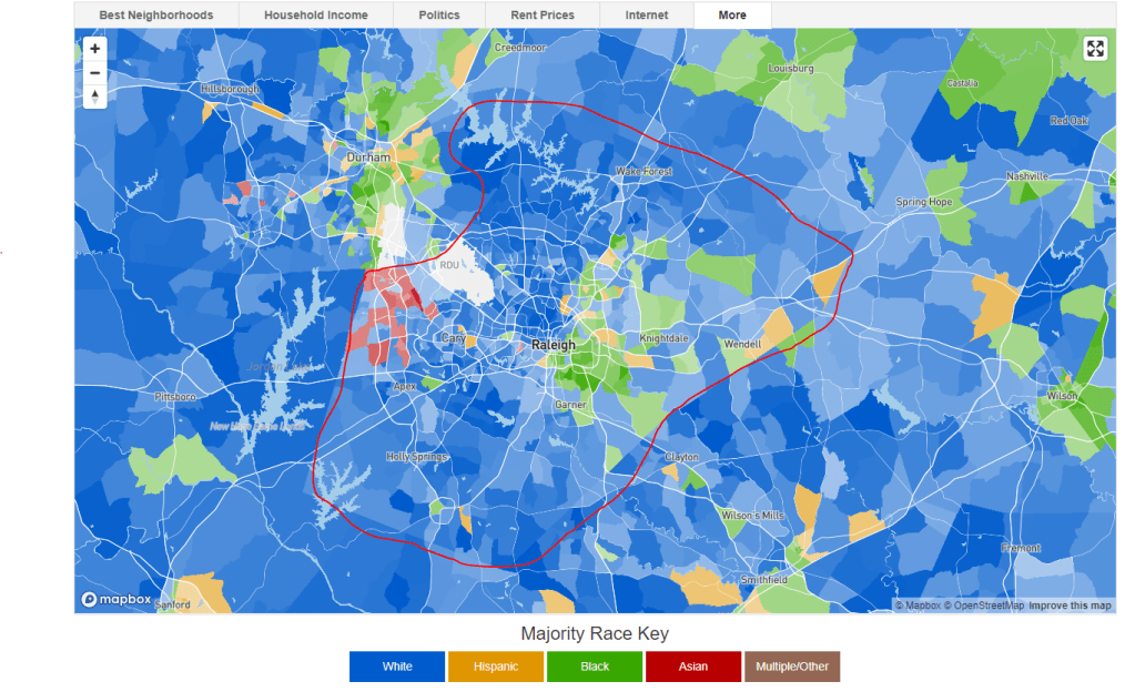 In short, areas South and East of Downtown Raleigh see the higher rates of Black and Hispanic Populations while also seeing lower household income values. Portions of West Cary and Morrisville also are home to a large influent Indian population.