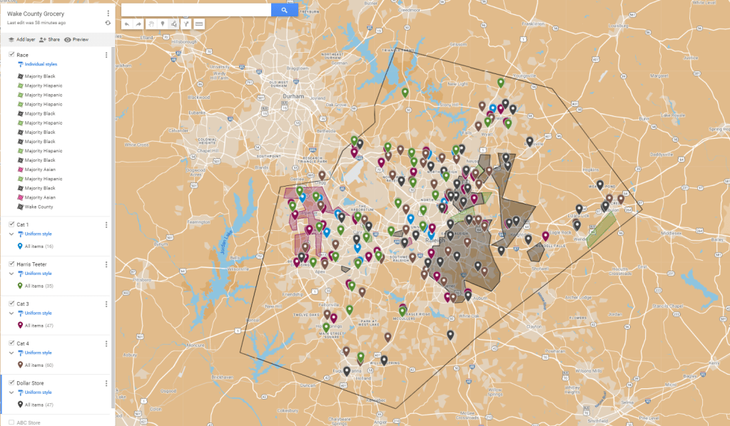 I’ve broken the area grocery stores into four categories and also added dollar stores and ABC stores for comparison sake. Wake County’s entire boundary was used to capture a wider range of residents.
