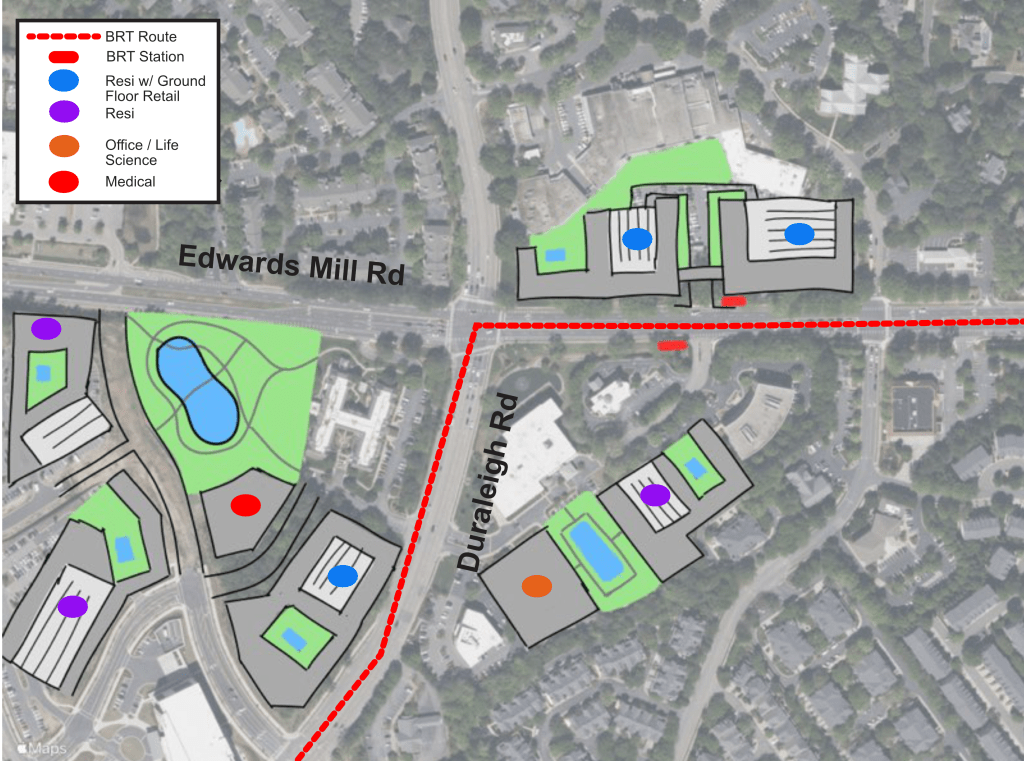 In the future, filling out the remaining parcels North of UNC rex can create a walkable village. Revamping the surface lot of the shopping center also contributes to this vision for the Old Raleigh Village BRT station.