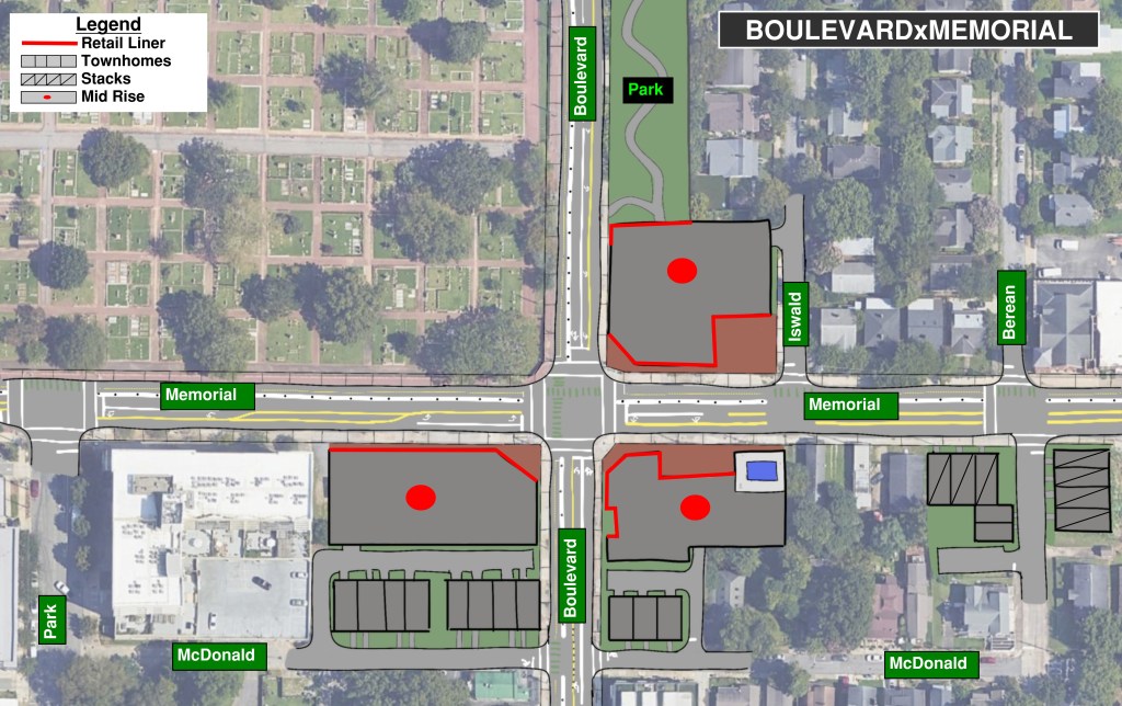 - Two stacked townhome buildings at the corner of Berean and Memorial