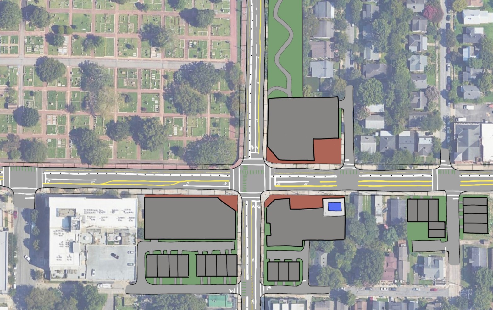 Transforming this corner from a car-oriented pass-through to a neighborhood center with an infusion of infill: